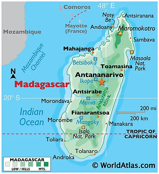 Located off the coast of East Africa in the Indian Ocean, Madagascar is the second-largest island country in the world. It covers an area of t 592,800 sq. kilometers. The country can be divided into three parallel longitudinal physiographic regions. The coastal strip in the east, the central plateau, and the western regions of low plateaus and plains.