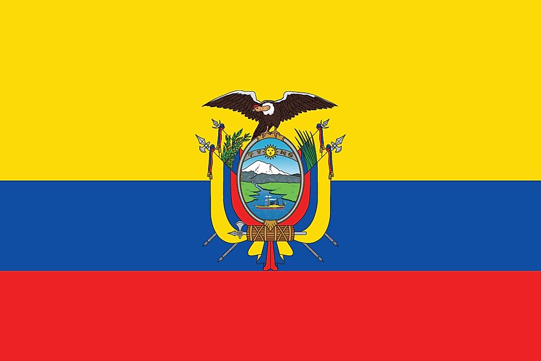 The National Flag of Ecuador features three horizontal bands of yellow (top, double-width), blue, and red; with the coat of arms superimposed at the center of the flag. The yellow color represents sunshine, grain, mineral wealth, and fertile soil. The blue color symbolizes the sky, sea, and rivers. The red color represents the blood of patriots spilled during the struggle for freedom and justice. The flag has a length-to-width proportion ratio of 2:3.