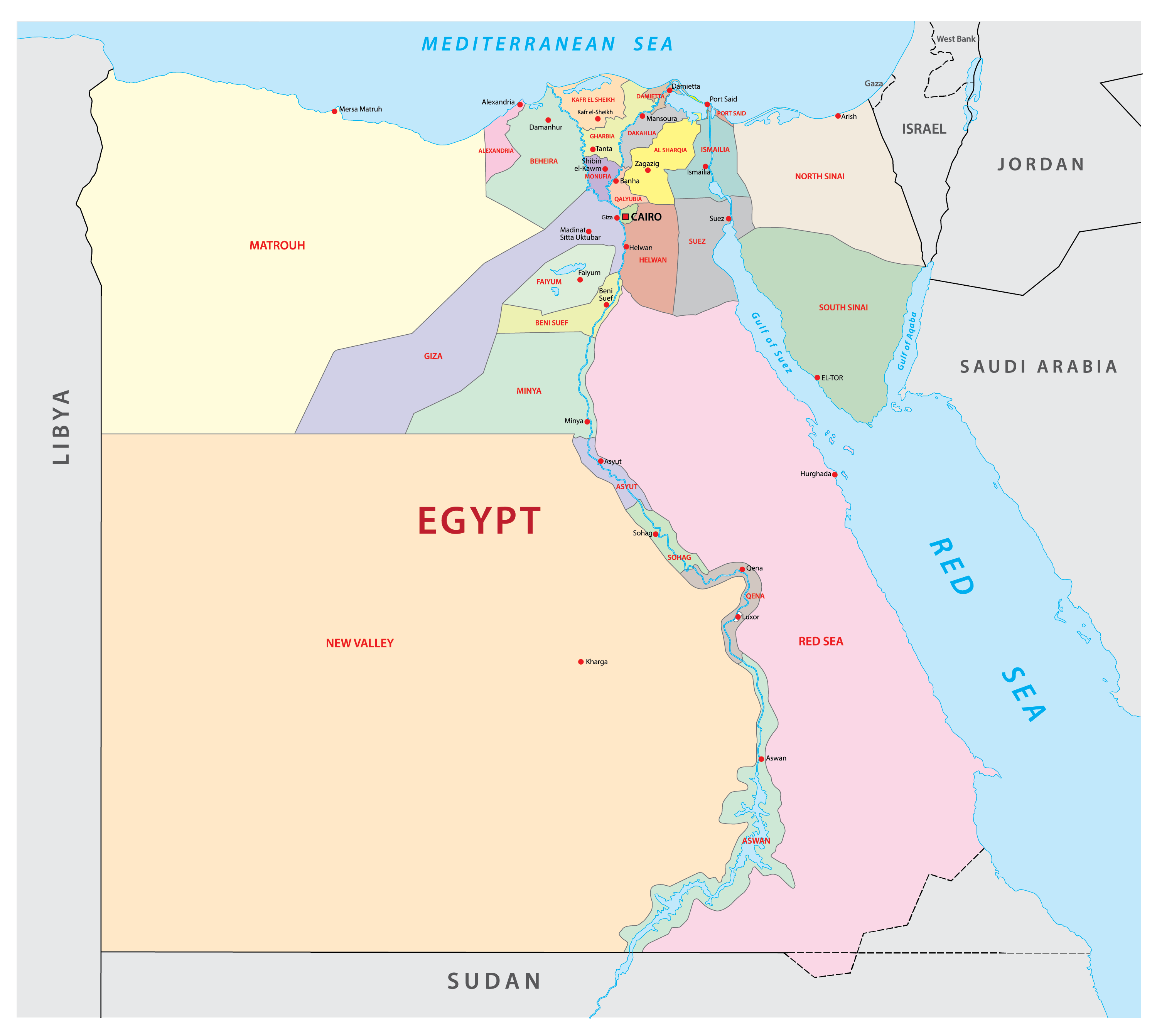 Egypt has 27 governorates. These are Ad Daqahliyah, Al Bahr al Ahmar (Red Sea), Al Buhayrah, Al Fayyum, Al Gharbiyah, Al Iskandariyah (Alexandria), Al Isma'iliyah (Ismailia), Al Jizah (Giza), Al Minufiyah, Al Minya, Al Qahirah (Cairo), Al Qalyubiyah, Al Uqsur (Luxor), Al Wadi al Jadid (New Valley), As Suways (Suez), Ash Sharqiyah, Aswan, Asyut, Bani Suwayf, Bur Sa'id (Port Said), Dumyat (Damietta), Janub Sina' (South Sinai), Kafr ash Shaykh, Matruh, Qina, Shamal Sina' (North Sinai), Suhaj.