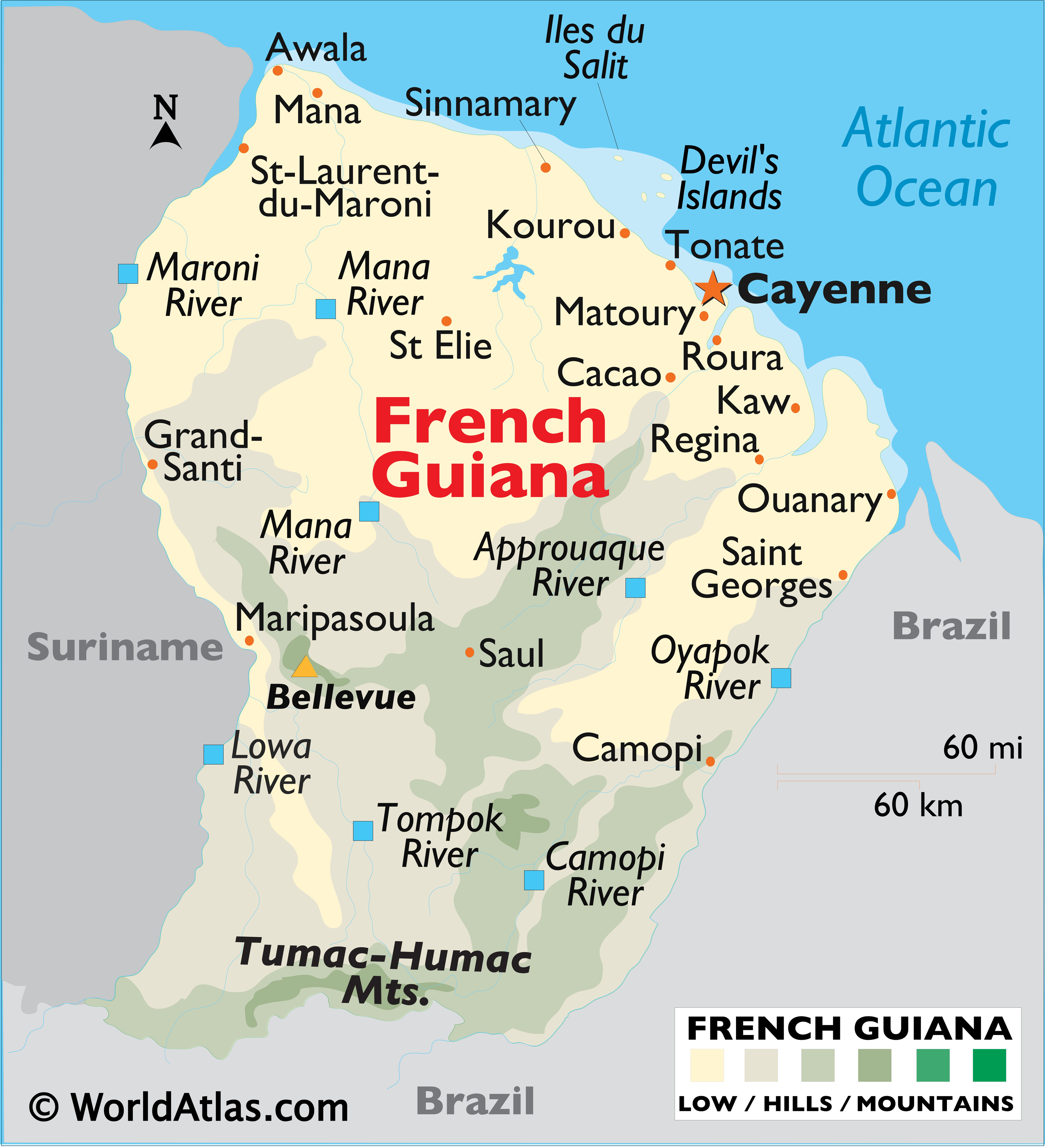The Tumac-Humac Mountains can be found in the south forming a natural border with Brazil. The land slowly begins to rise in the central regions of the country. The highest point in French Guiana, as marked by an upright yellow triangle is, Bellevue de l’lnini, which rises to an elevation of 2,792 ft. (851m). The lowest point is the Atlantic Ocean (0m).