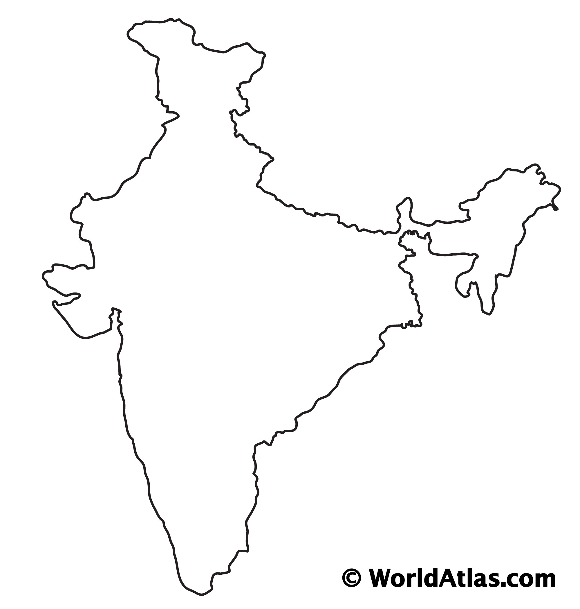 The above blank map represents India - a large country located on the Indian subcontinent in south-central Asia. The above map can be downloaded, printed and used for geography education purposes like map-pointing and coloring activities.