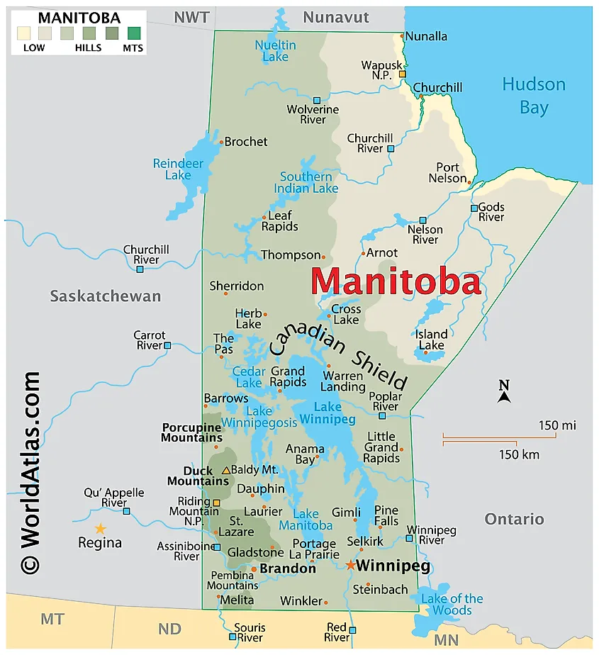 The above outline map represents the Province of Manitoba, located in the central part of Canada.