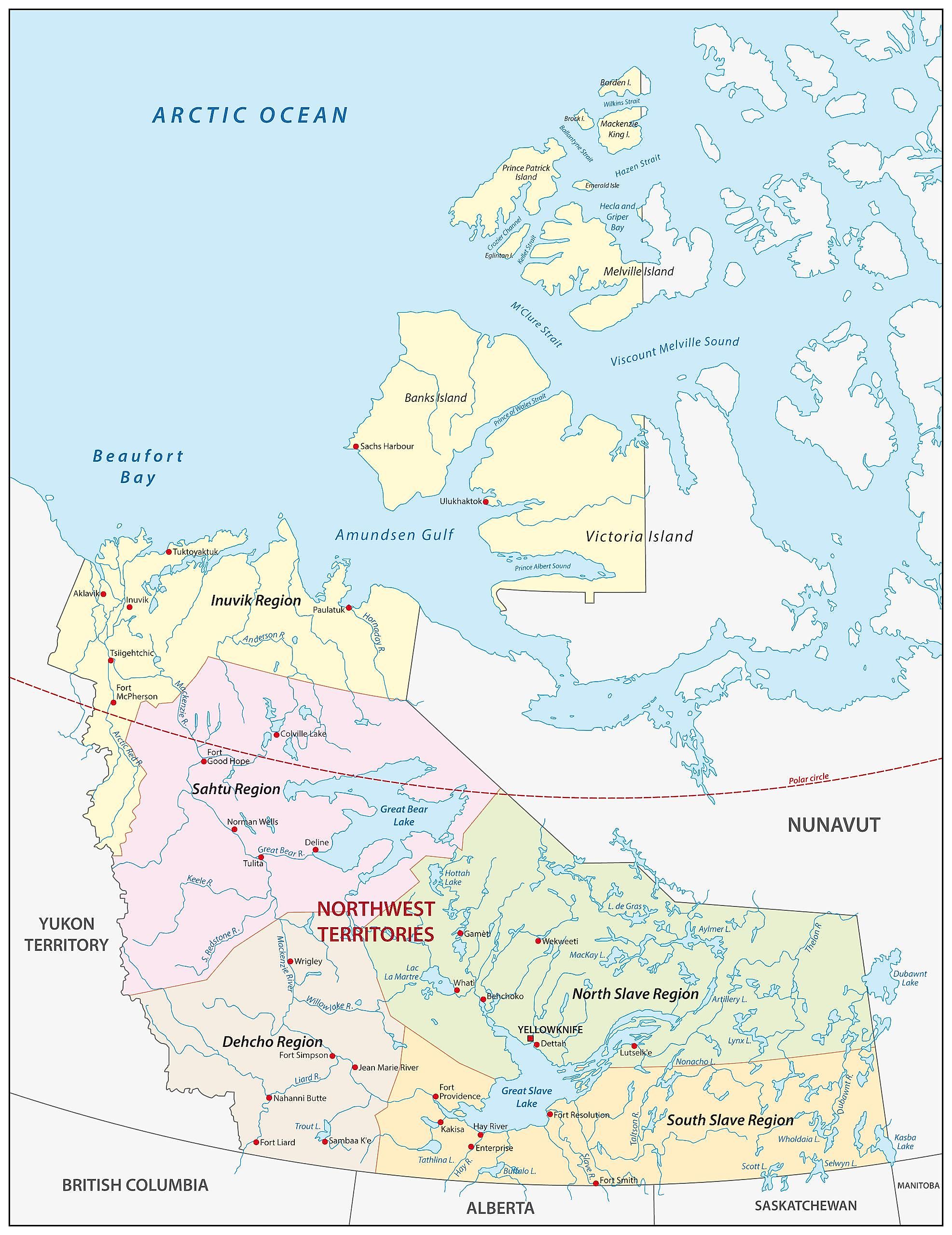 The Northwest Territories is a Canadian federal territory that is divided into 5 administrative regions. In alphabetical order, these regions are Dehcho Region, Inuvik Region, North Slave Region, Sahtu Region, and South Slave Region.