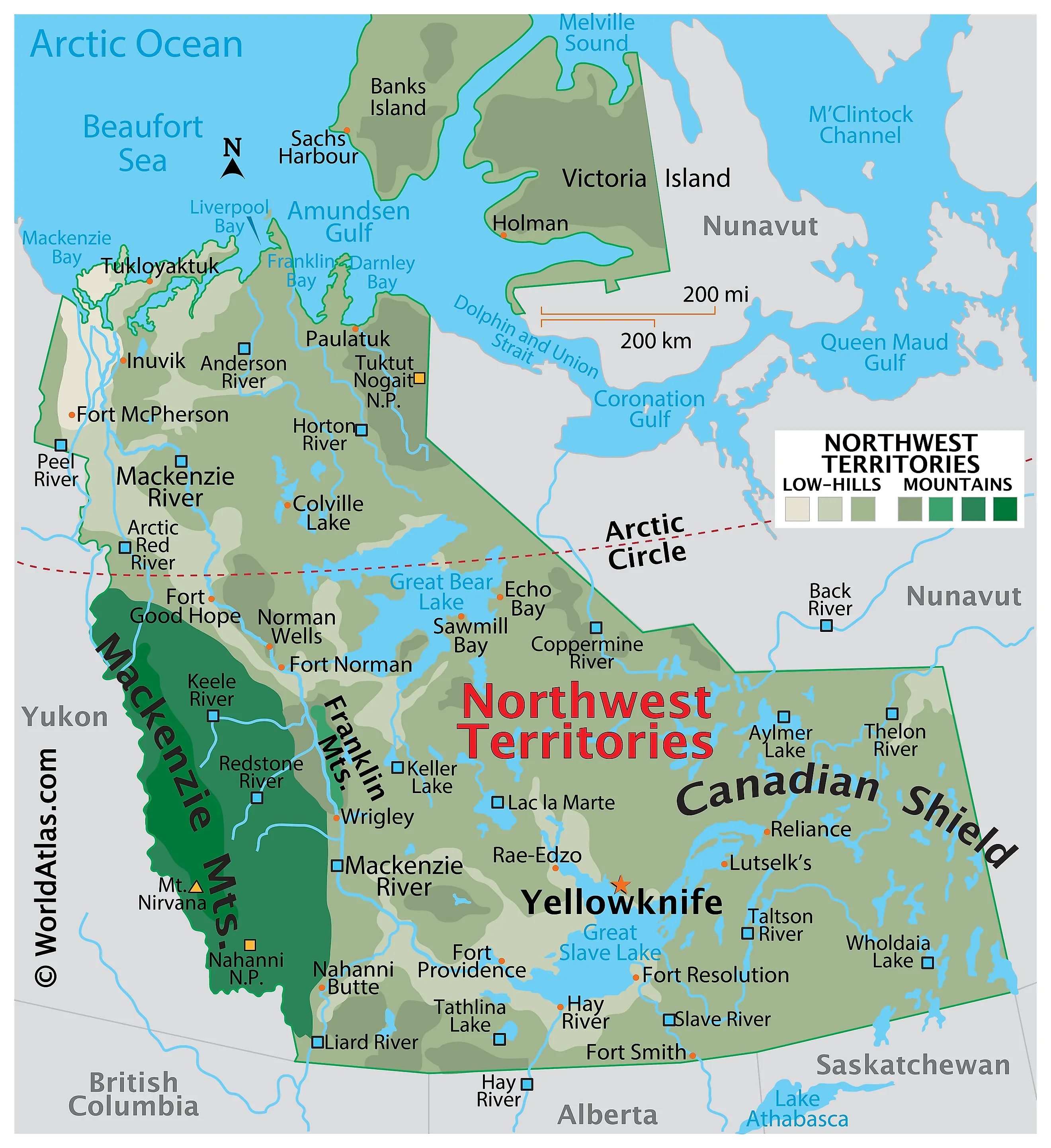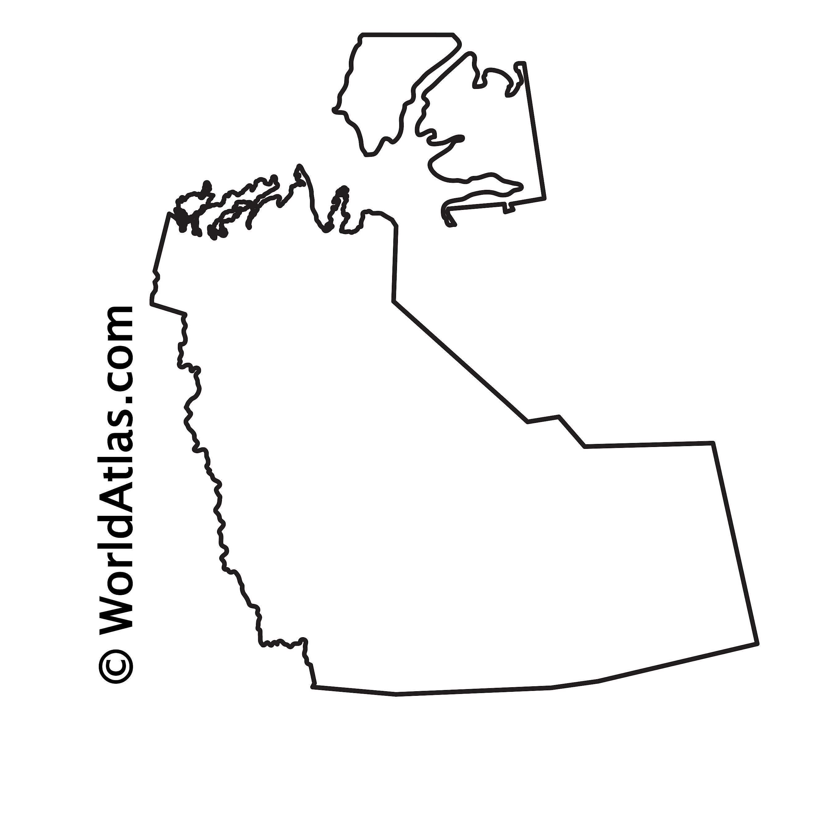 The above blank map represents the Northwest Territories, located in the northwestern part of Canada. The above map can be downloaded, printed, and used for geography education purposes like map-pointing and coloring activities.