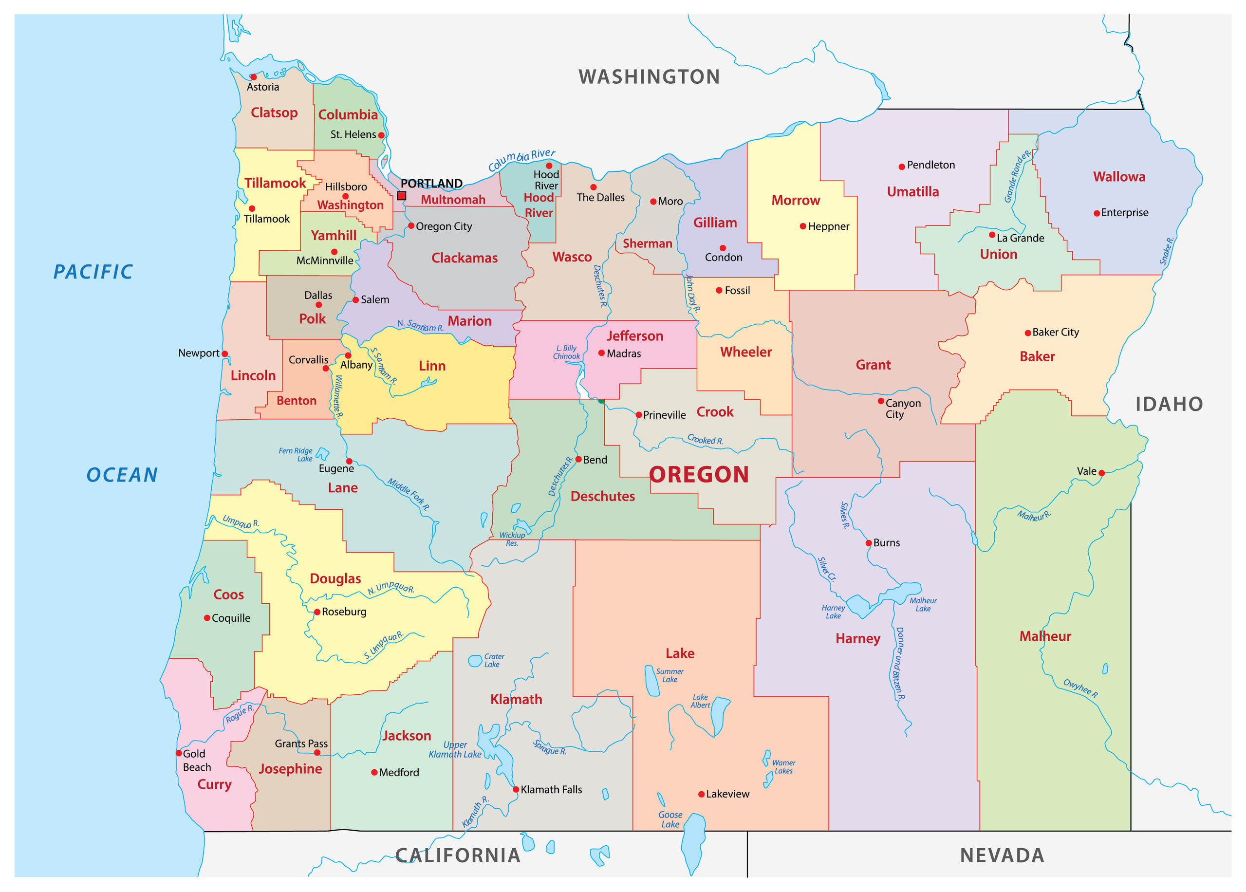 The State of Oregon is divided into 36 counties. In alphabetical order, these counties are: Baker, Benton, Clackamas, Clatsop, Columbia, Coos, Crook, Curry, Deschutes, Douglas, Gilliam, Grant, Harney, Hood River, Jackson, Jefferson, Josephine, Klamath, Lake, Lane, Lincoln, Linn, Malheur, Marion, Morrow, Multnomah, Polk, Sherman, Tillamook, Umatilla, Union, Wallowa, Wasco, Washington, Wheeler, and Yamhill.