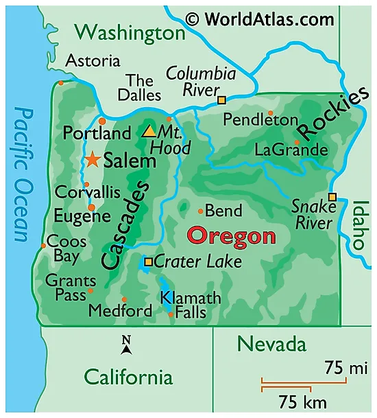 Oregon, also nicknamed, “The Beaver State”, is located in the Pacific Northwest United States. It shares its northern border with Washington, its eastern border with Idaho, its southern border with Nevada and California, and its western coastline with the Pacific Ocean.