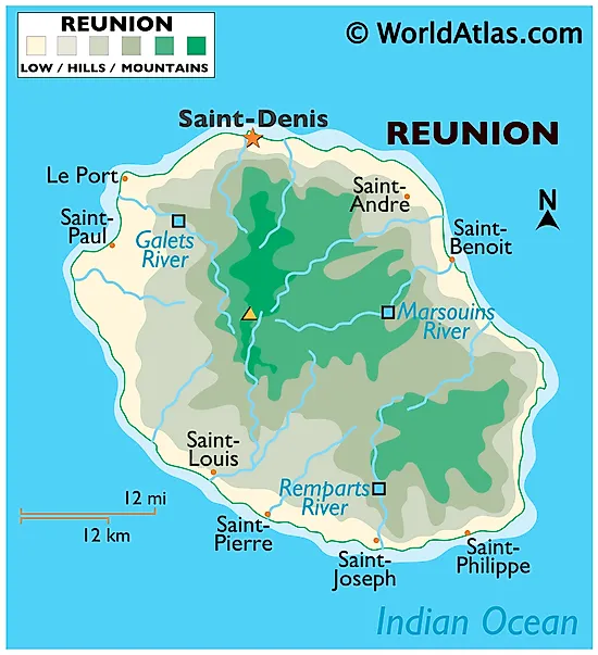 Piton des Neiges volcano can be found in the west-central part of the island. This is the island's highest point which rises to an elevation of 3,069m. Reunion is a rugged volcanic island and consists of rugged mountains that are dissected by short rivers. Situated on the eastern part of the Island is Piton de la Fournaise – an active shield volcano. The lowest point is at the Indian Ocean (0m)