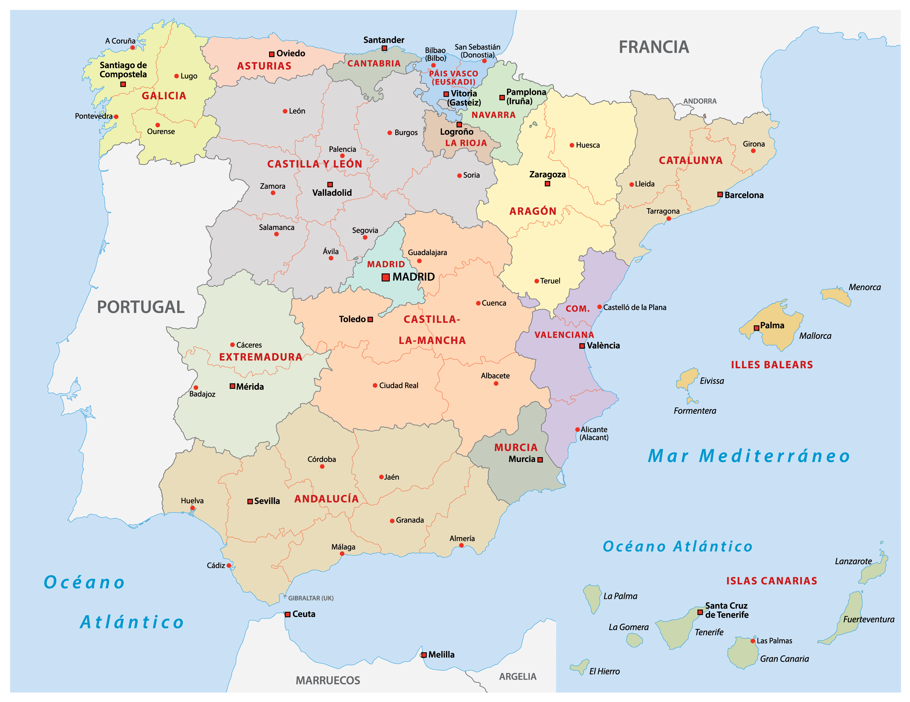 Spain (officially, the Kingdom of Spain) is divided into 17 autonomous communities (comunidades autonomas, sing. comunidad autonoma) and 2 autonomous cities (ciudades autonomas, sing. ciudad autonoma). The autonomous communities are: Andalusia, Catalonia (Catalan), Madrid, Comunitat Valenciana [Valencian Community], Galicia, Castilla-Leon, Euskadi (Basque) [Basque Country], Castilla-La Mancha, Canarias (Canary Islands), Murcia, Aragon, Extremadura, Illes Baleares (Balearic Islands), Asturias, Navarre (Castilian), Cantabria, and La Rioja. The 2 autonomous cities are: Ceuta and Melilla. The autonomous communities are further subdivided into provinces and smaller subdivisions.