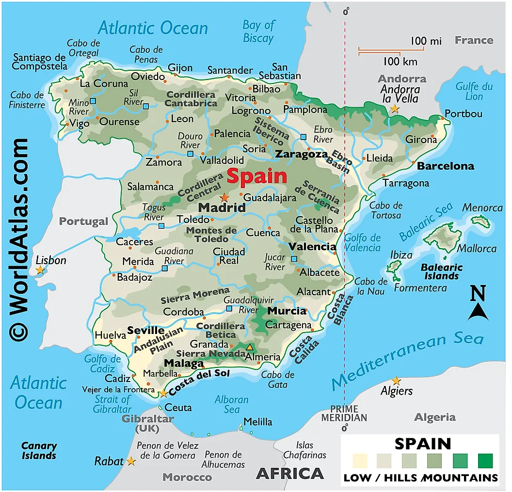 Coastal Plains: Spain's coastal plains stretch along both its Mediterranean and Atlantic coastlines. These plains are often narrow, squeezed between the sea and nearby mountain ranges. With mild climates and fertile soils, they support agriculture, particularly citrus fruits, olives, and vineyards. Moreover, large settlements dot these coastal plains, and over time, they have grown into significant centers of trading, political concentration, and social infrastructure.